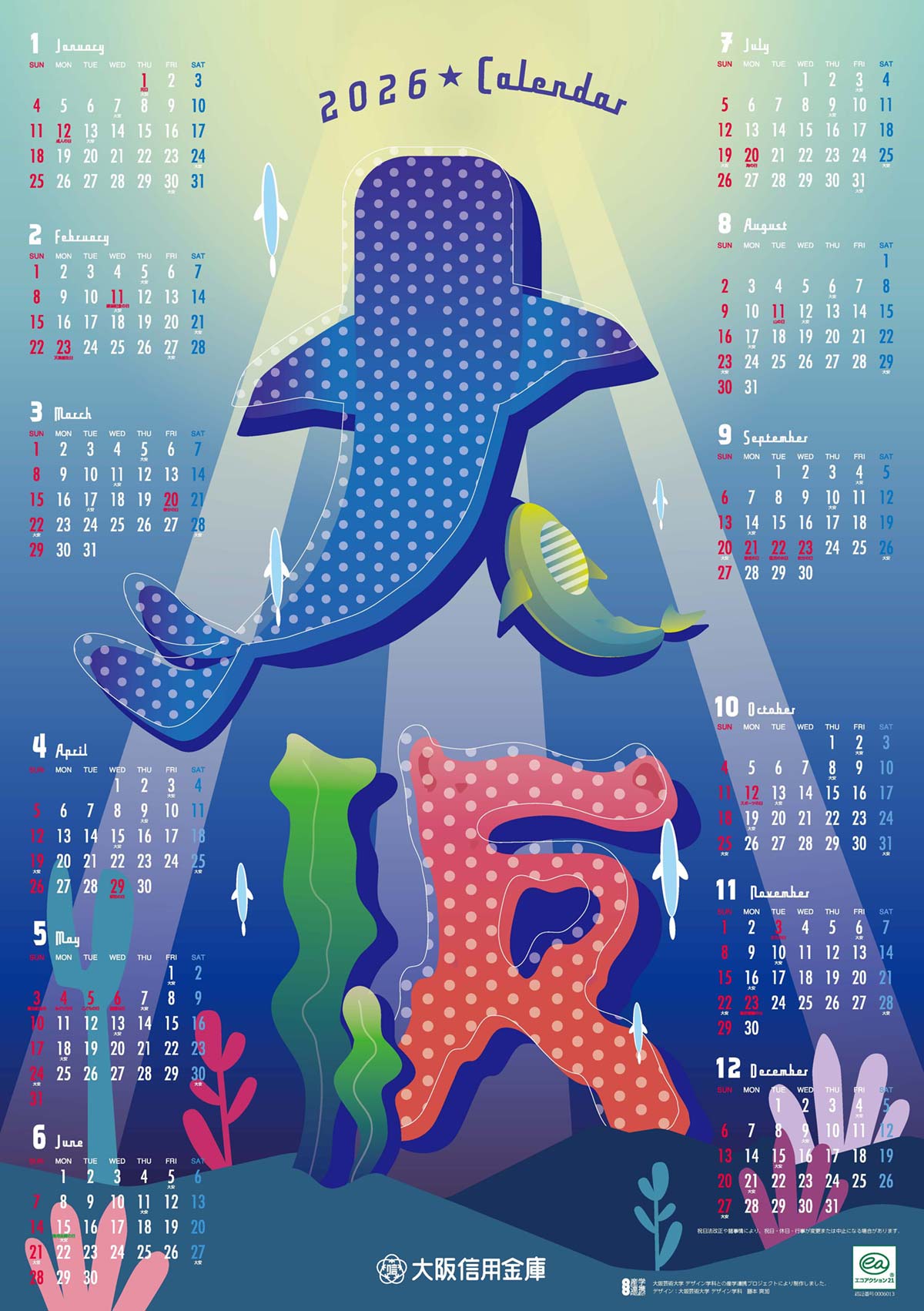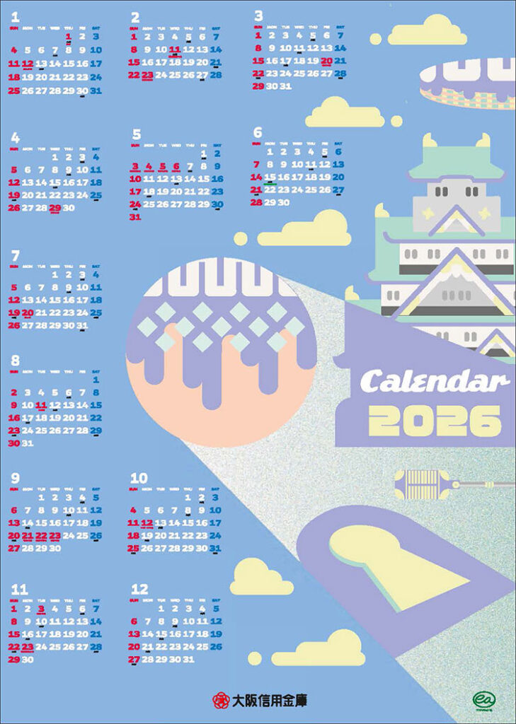 海中の光や生き物の動きをモチーフに、ポップで色鮮やかな世界をカレンダーに閉じ込めています。珊瑚のカラフルな色合いがにぎやかさを演出しつつ、構成全体はスタイリッシュにまとめました。見ているだけで明るい気持ちになれる、大阪の“海のパラダイス”を表現した作品です。
