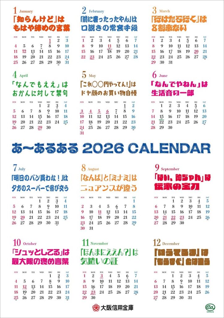 「これ、あるあるやな」と笑い合うことで生まれる交流こそ、大阪の元気の源です。このカレンダーが、人と人をつなぐコミュニケーションツールとなることを願っています。